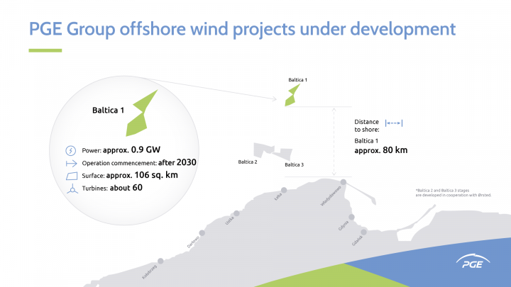 Проект Baltica 1, с его мощностью около 900 МВт, является одним из трёх ключевых объектов, реализуемых в настоящее время группой PGE в польской части Балтийского моря. Будущая ветряная электростанция будет располагаться примерно в 80 километрах от побережья, вблизи города Леба в Поморском воеводстве.
